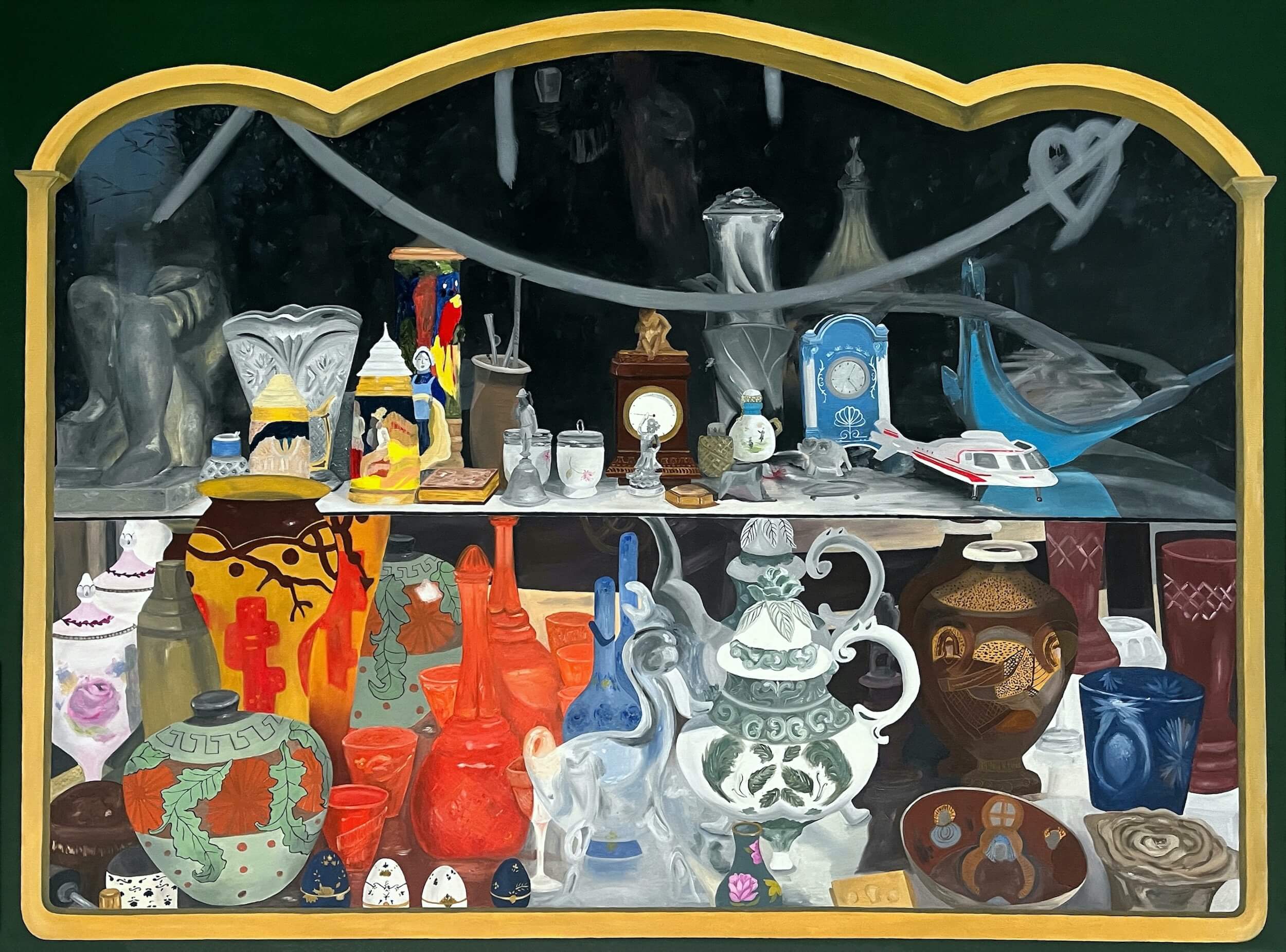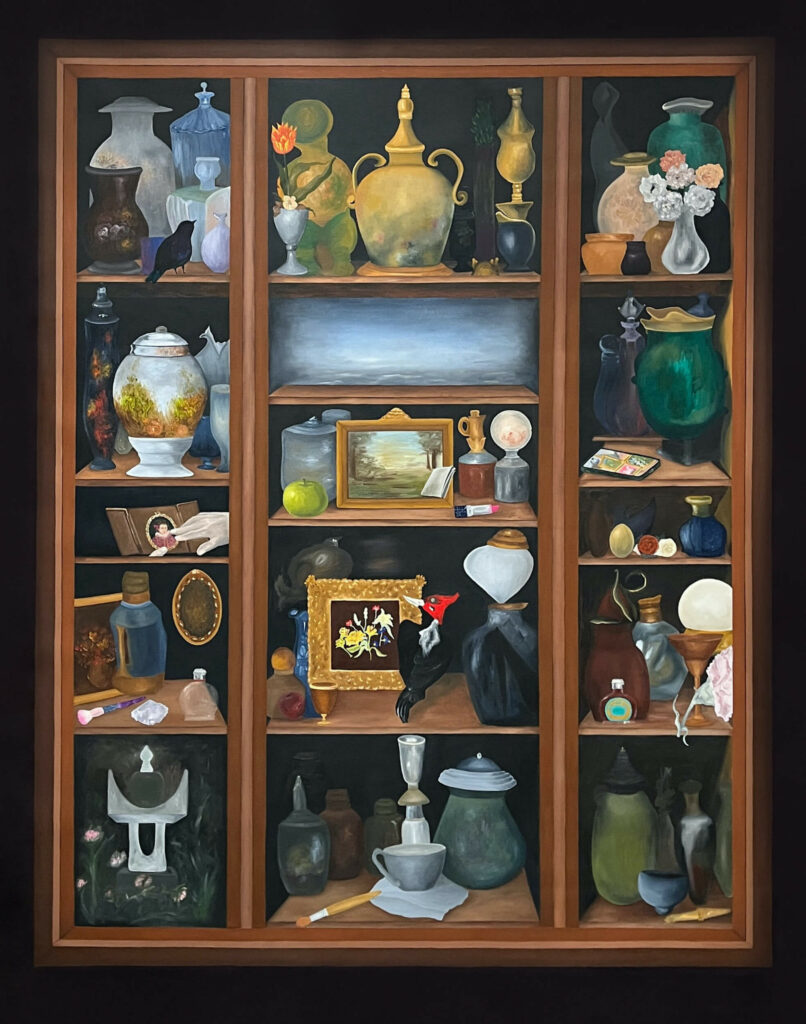 Mi proceso de trabajo va cambiando según la serie que esté pintando, pero siempre salgo a buscar las imágenes, no suelo buscarlas en internet. En este momento, recorro ventas de garage, anticuarios y todo lo que se le parezca en busca de referencias visuales para mis pinturas. Incluso, empecé a adquirir algunos objetos.