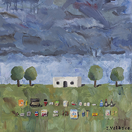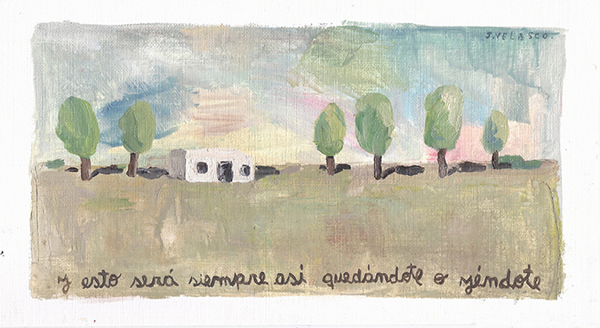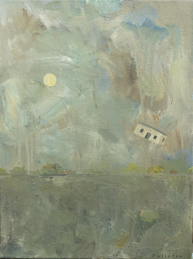 En general tengo en mente un par de ideas y en algún momento alguna avanza más, pero puede pasar que vaya haciendo de a 2 o 3 al mismo tiempo. No suelo hacer bocetos, a lo sumo algún esquema muy básico o alguna nota escrita en un papelito, unas indicaciones. Sobre el soporte por ahi marco unas guías, como puede ser trazar el horizonte, o marcar dónde va a ir un objeto, pero no mucho más. Suelo pintar de un modo medio básico: primero lo que está atrás y después voy sumando. Todo esto tiene que ver con que nunca tengo totalmente definida una pintura antes de pintarla.